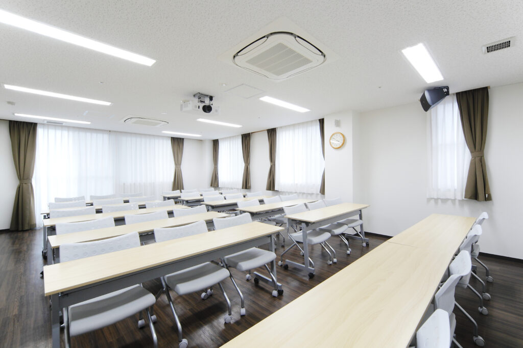最大50名を収容できる広々とした空間は、職員のための研修室として機能します。壁一面に投影可能な大型プロジェクターを駆使したマルチメディア研修を行い、スタッフ一人ひとりの専門知識と技術の向上に努めています。
