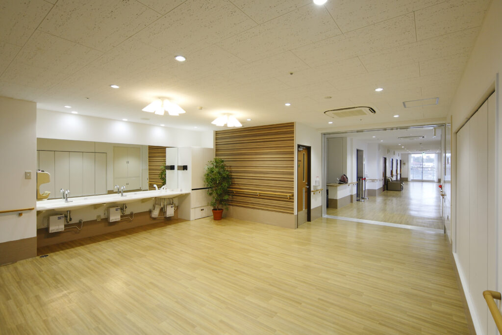 リリックケアセンターの2階生活スペースの中心には、単なる廊下でも洗面所でもない、特別な意図をもって設計された広々とした空間があります。