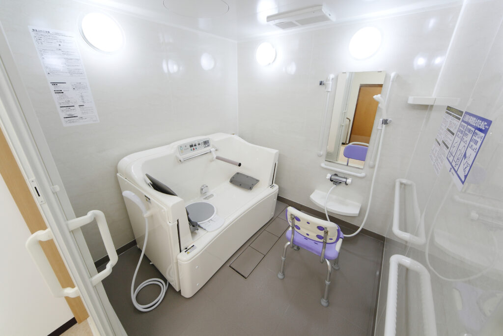 浴室には、座ったままで安全に湯船に浸かれる最新の設備を導入。介助が必要な方や車椅子をご利用の方も、スタッフがしっかりとサポートいたしますので、安心して気持ちの良いバスタイムをお楽しみください。